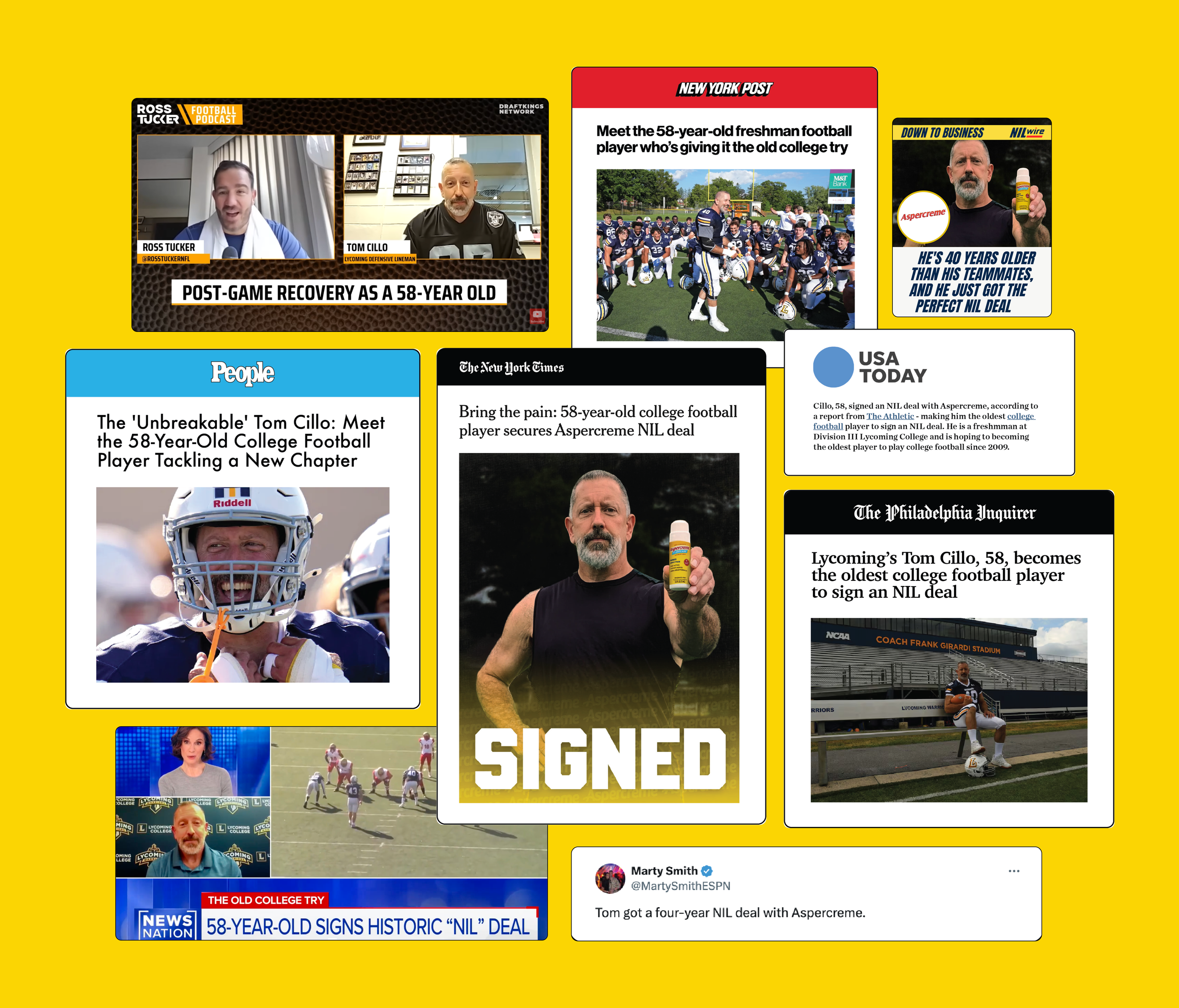 Within days of discovering him, Aspercreme signed Tom to a historic NIL sponsorship deal, making him the oldest ever player to receive one. The New York Times quickly called it “the most clever NIL deal of the season.”